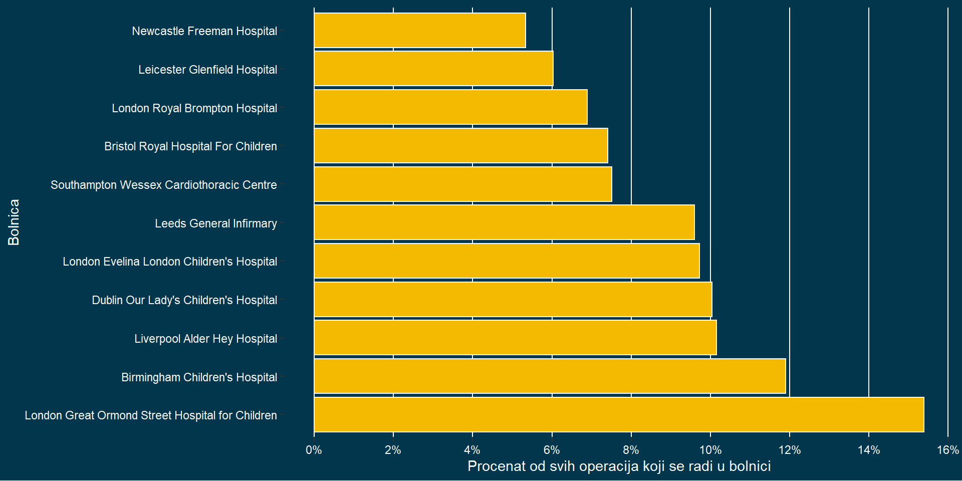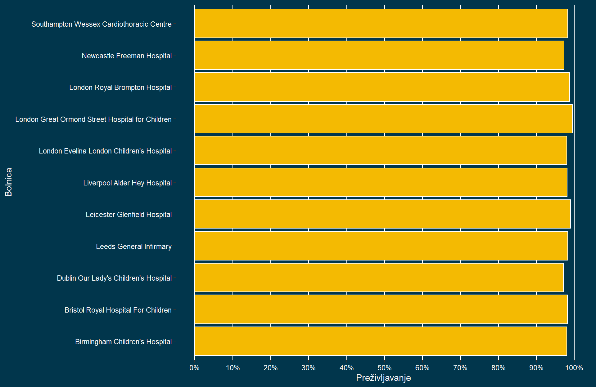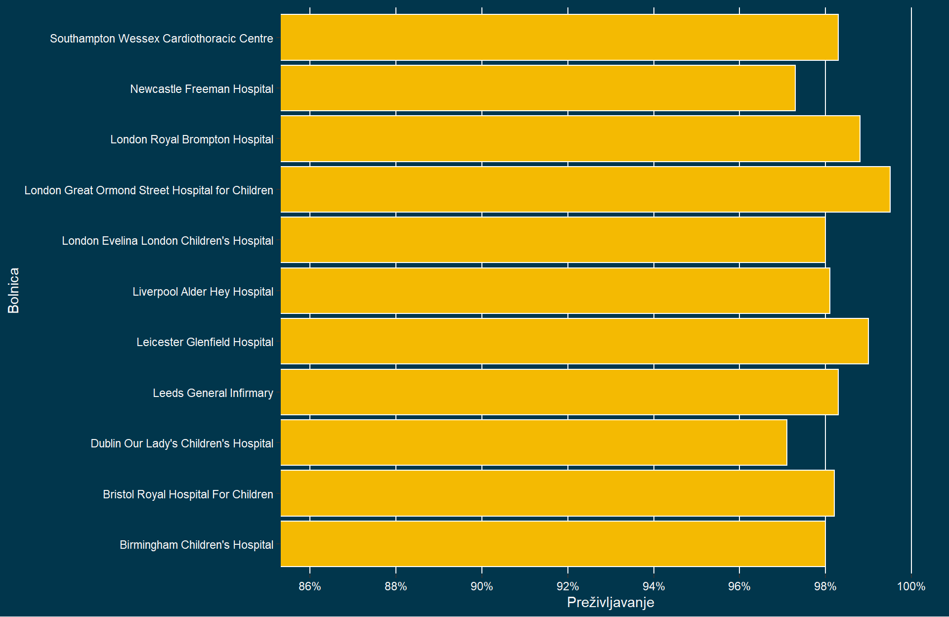 | Bolnica | Operacije | Prezivelo | Umrlo | Preživljavanje | Smrtnost |